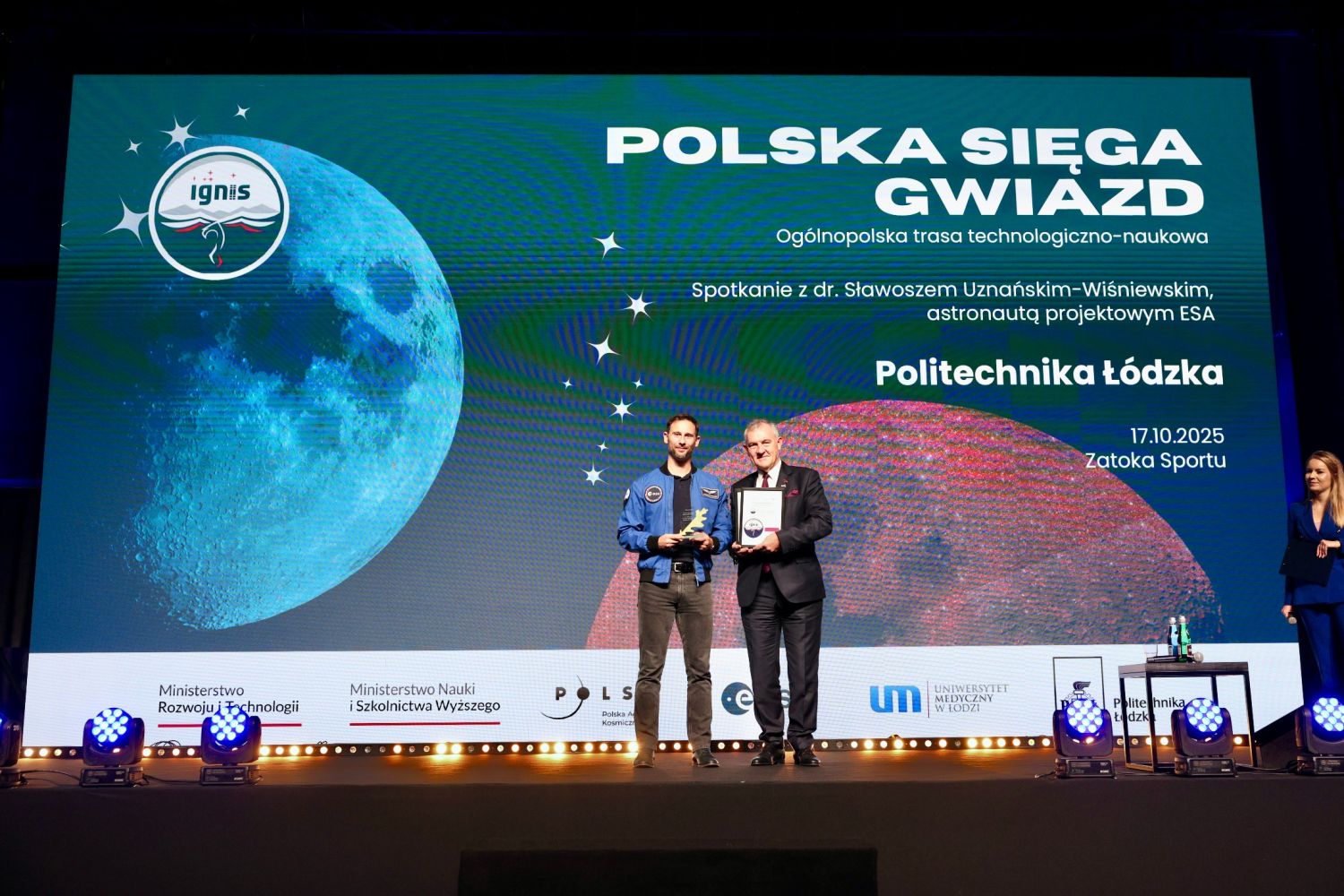Zaawansowane technologie, 13 eksperymentów na ISS, rozmowy o polskich ambicjach kosmicznych a przede wszystkim bezpośrednie spotkania z polskim astronautą projektowym ESA dr. Sławoszem Uznańskim-Wiśniewskim. To wszystko czeka uczestników trasy „IGNIS – Polska sięga gwiazd”. Inicjatywa realizowana przez Ministerstwo Rozwoju i Technologii, Ministerstwo Nauki i Szkolnictwa Wyższego oraz Polską Agencję Kosmiczną we współpracy z Europejską Agencją Kosmiczną ma na celu inspirowanie środowiska akademickiego polskimi badaniami kosmicznymi oraz nowoczesnymi technologiami orbitalnymi. Astronauta projektowy ESA odwiedzi wiodące uczelnie w całym kraju. Trasa wystartowała 15 października na Politechnice Warszawskiej. Za nami drugi przystanek trasy, czyli spotkanie w Łodzi, które zorganizowała Politechnika Łódzka we współpracy z Uniwersytetem Medycznym w Łodzi.
