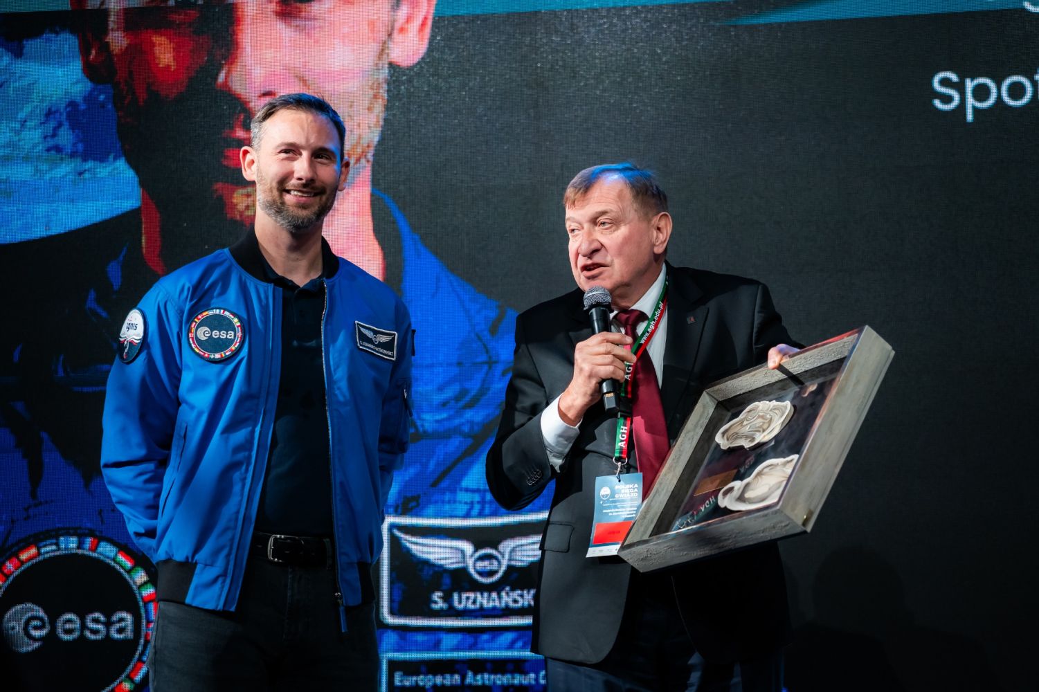 Sławosz Uznański-Wiśniewski przekazał przedstawicielowi Akademii Górniczo-Hutniczej pamiątkową biało-czerwoną flagę, pierwszy z narodowych symboli, która razem z nim poleciała na Międzynarodową Stację Kosmiczną.